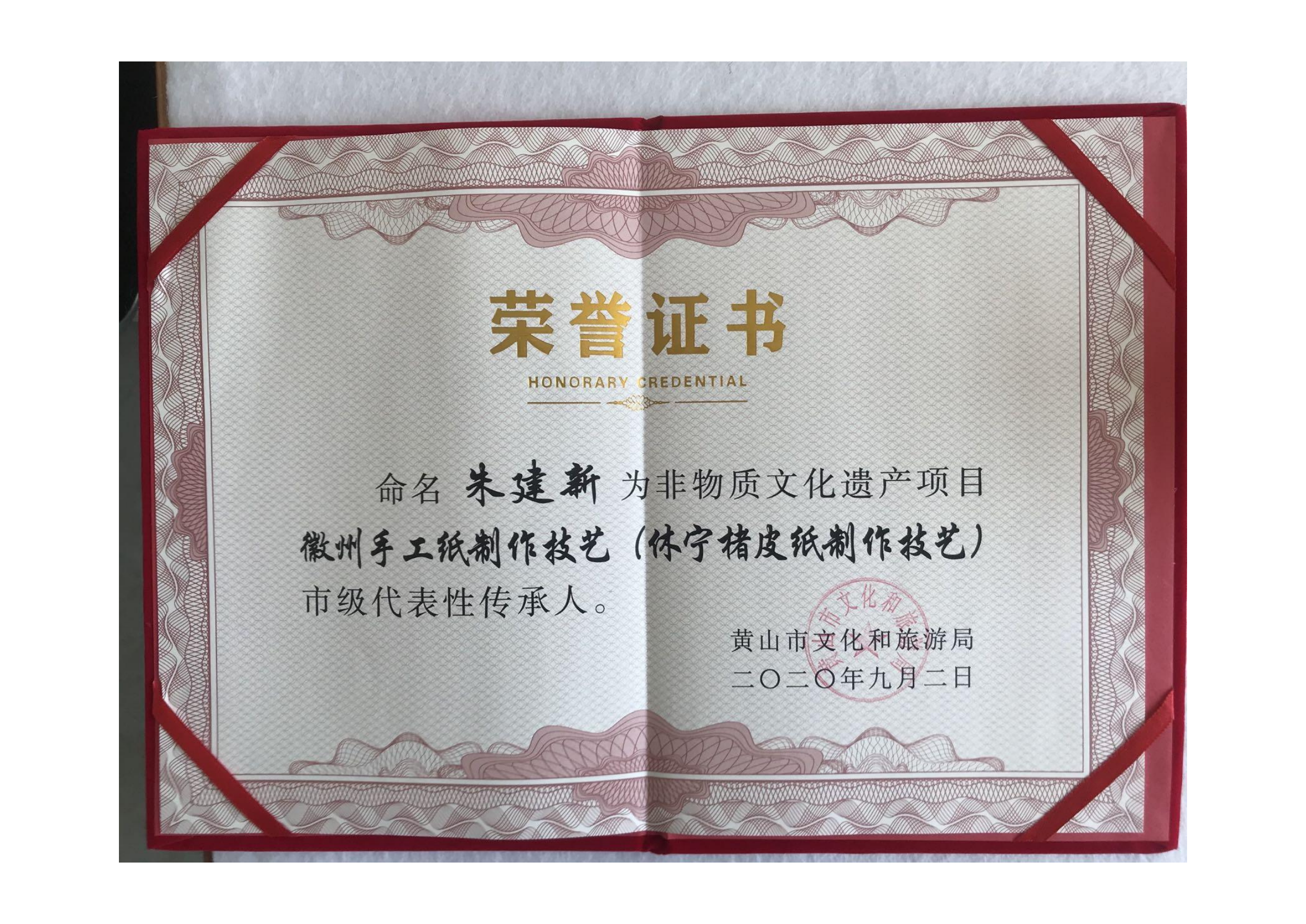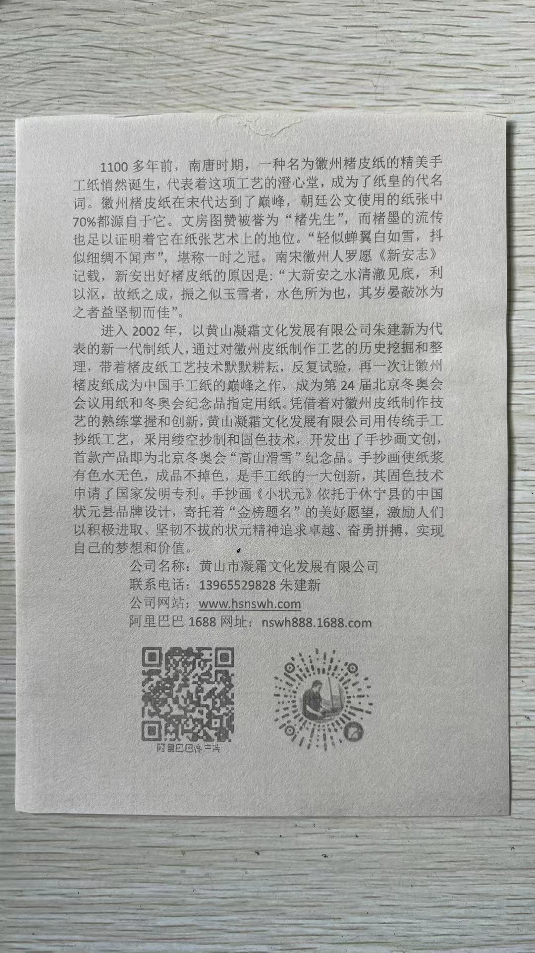2020年公司實現(xiàn)了文化類規(guī)上企業(yè),迄今已申請了15項發(fā)明專利,19項實用新型專利,其中已授權(quán)發(fā)明專利3項,實用新型專利11項;2022年,公司為北京第24屆冬季奧運會提供楮皮紙和紀(jì)念品,非遺傳承人朱建新被授予北京2022年冬季奧會參與證書,以感謝第24屆冬奧會取得圓滿成功做出的貢獻(xiàn)。2022年-2024年,朱建新被中國科技大學(xué)聘為《中國筆墨紙硯》全校公選課特聘導(dǎo)師;2023年,朱建新獲省級非遺傳承人稱號、“黃山工匠”稱號。